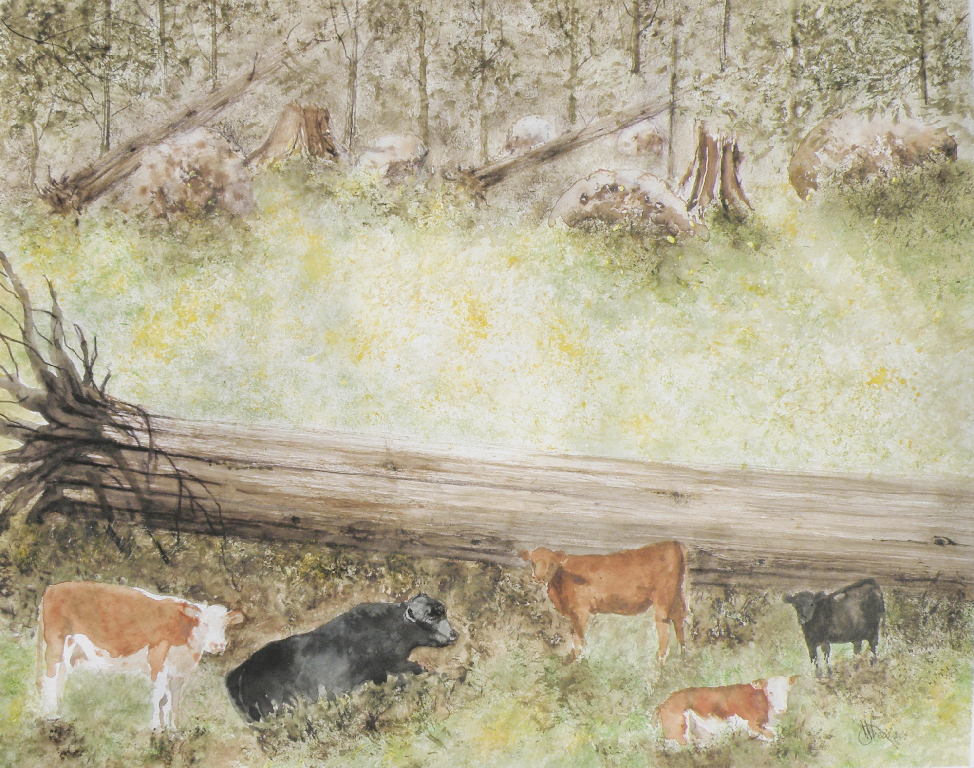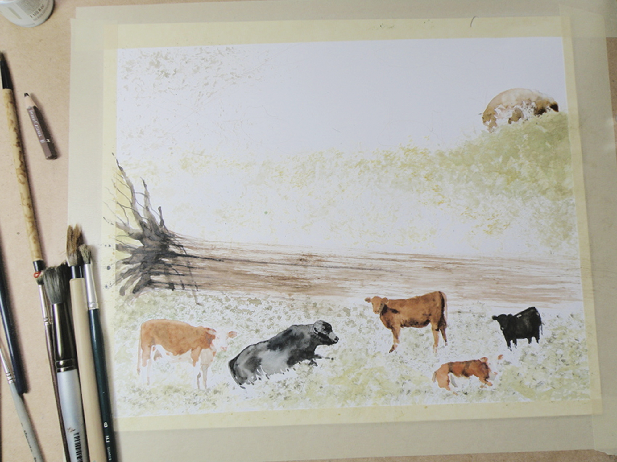 The very prominent tree in the painting is placed to provide focus. Rather than leave in the barbed wire fence (in front of them), a natural enclosure is placed behind to sneak a storyline into the scene (the best grass lies out of reach)—that, and taking out the wire fence gives a more natural feel to the setting.