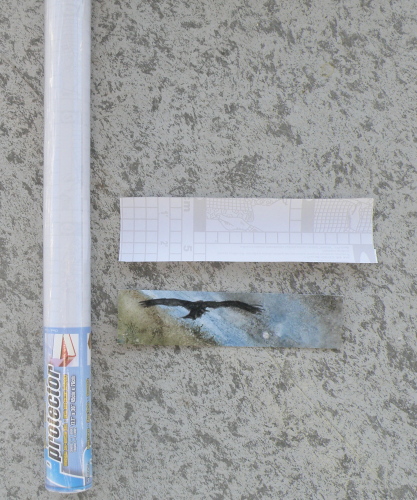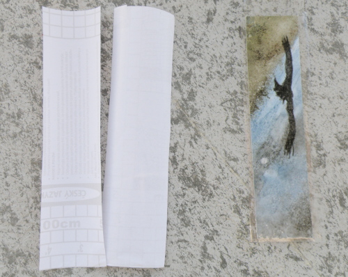 Bookmark part of rejected painting is cut out and also artist signed on front; 2 pieces of protective lamination paper from the dollar store are then cut a bit larger than the bookmark…