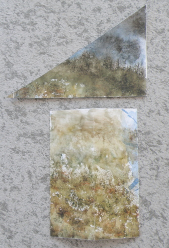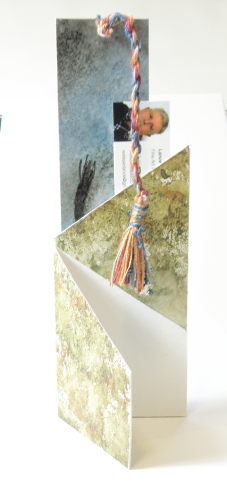 ….the remains of the painting reject get chopped into pieces, the largest one measuring wider than 2 widths of the bookmark, because it is going to serve as a sleeve holder…..the smaller piece will become the gift giver’s “To:/From:” tag