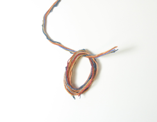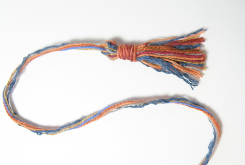 ….the frayed ends are trimmed from the knot and the noosed yarn, then the looped bottom is sliced completely across to create the tassel…..