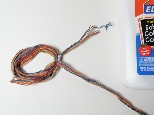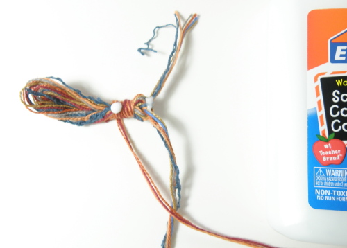 …..wrap a length of yarn below the knotted top to serve as the tassel’s ‘noose’, and secure that with another dab of glue, setting it all aside till the glue has soaked in and dried clear….