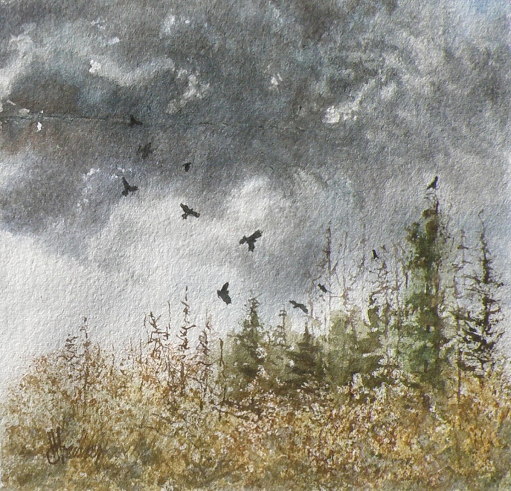 The temptation, at least for me, is to go about trying to recreate that memorable sky full of drama by mixing up a bucket of what might best be described as ‘peat bog grey’ or ‘burned frying pan umber’ and sloshing it onto the top of the picture.