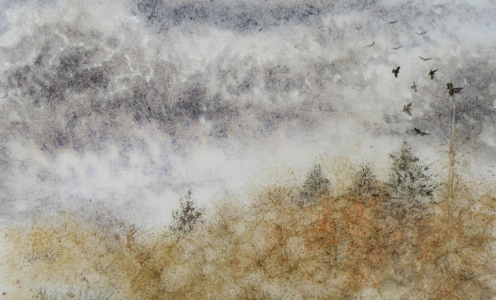 While this subject isn’t of any particular place, it reflects in spirit the type of terrain, moodiness of skies and proliferation of crows and ravens which are found here in Kamloops, B. C., Canada, as close to me as our own backyard: