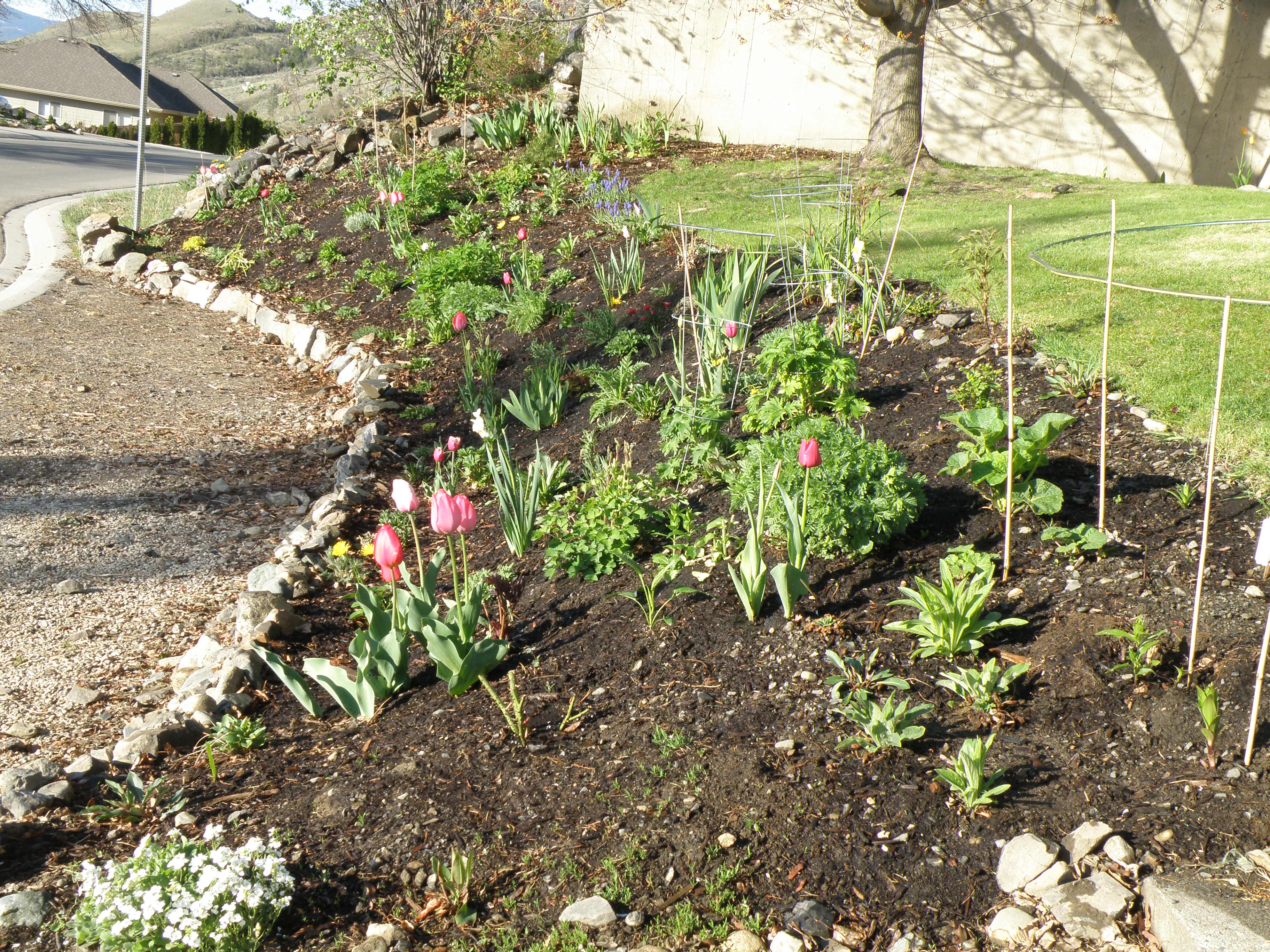 THIS IS WHAT IT LOOKED LIKE at April, 2010. That was after having removed the cedar mulch which the previous house owners had in place. It took quite a bit of figuring out and planning as to what kind of perennial flower bed was even possible on an embankment dominated by a large red Maple with an extensive root system. Quite apart from the challenges posed by the Maple was the discovery that almost every foot of ground contained very large rocks. That’s them, winding around the edge. Planting a simple purchase of a few perennials always entails hitting rock. Finding the edges of it, then lifting the *#@*! thing out and replacing it with good earth and only then actually doing some planting is one of the joys of living in a very rocky region. On the plus side of having mountain skree as ‘soil’ is knowing there is no problem when it comes to needing excellent drainage.
