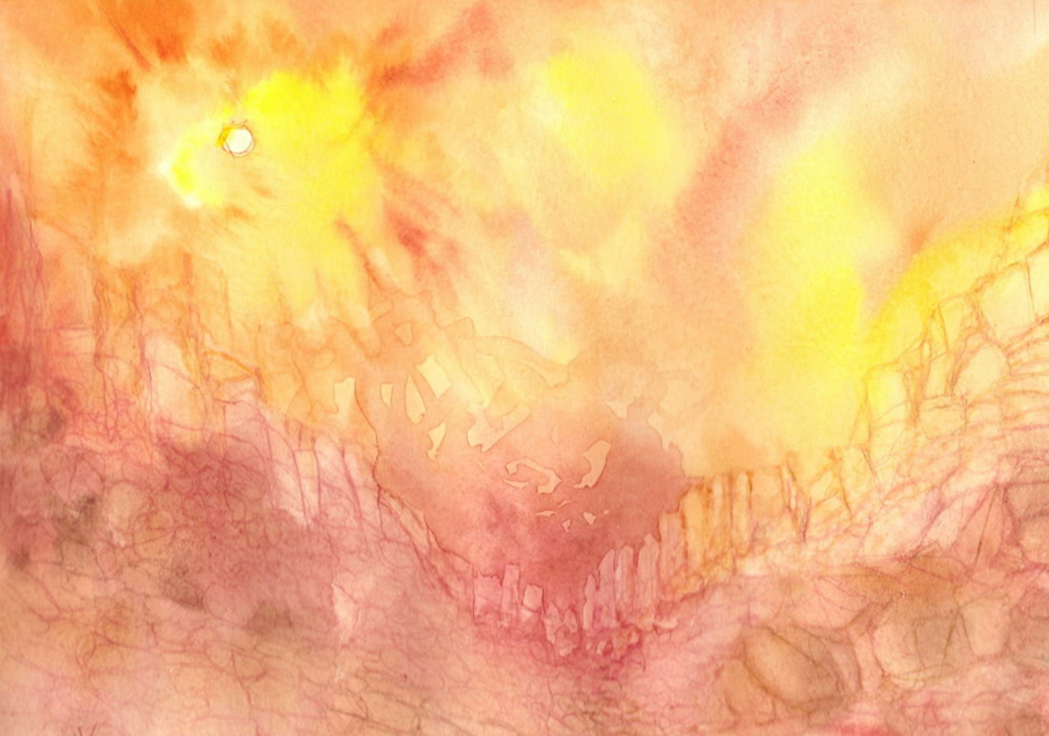Massive geological formations such as these require some form of treatment by a painter in order to adequately convey their uniqueness and grandeur. This watercolour attempts to do that by purposely choosing to paint directly into the sun.
