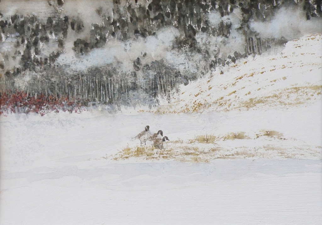 In honour of the occasion — the advent of real Winter — a wintry watercolour, not unlike what the countryside looks like presently. The subject no doubt wishes the wind were less than it is….
