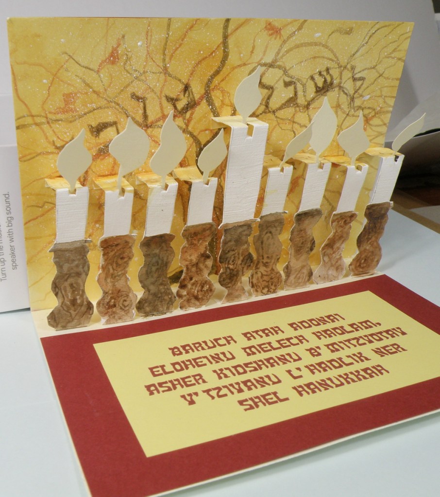 In honour of Hanukkah, and because here in Kamloops, B.C., there isn’t a Hanukkah card anywhere to be found, I’ve designed and made a pop-up card for my former mother-in-law: