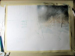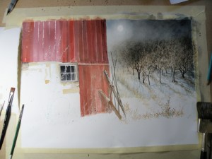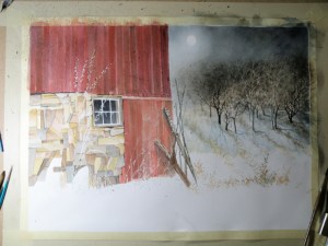 Personally, like writers who enjoy the challenge of staying within the bounds of iambic pentameter and composing 14 line sonnets, being ‘confined’ to the rather strict parameters of traditional watercolour is rewarding. These protocols include reserving paper to serve as white in a painting (such as the moon in the above example) — and the white of the paper is what brings life to the pigments laid over it. And it means having to discover ways of creating texture which, in the end, remains just an illusion.