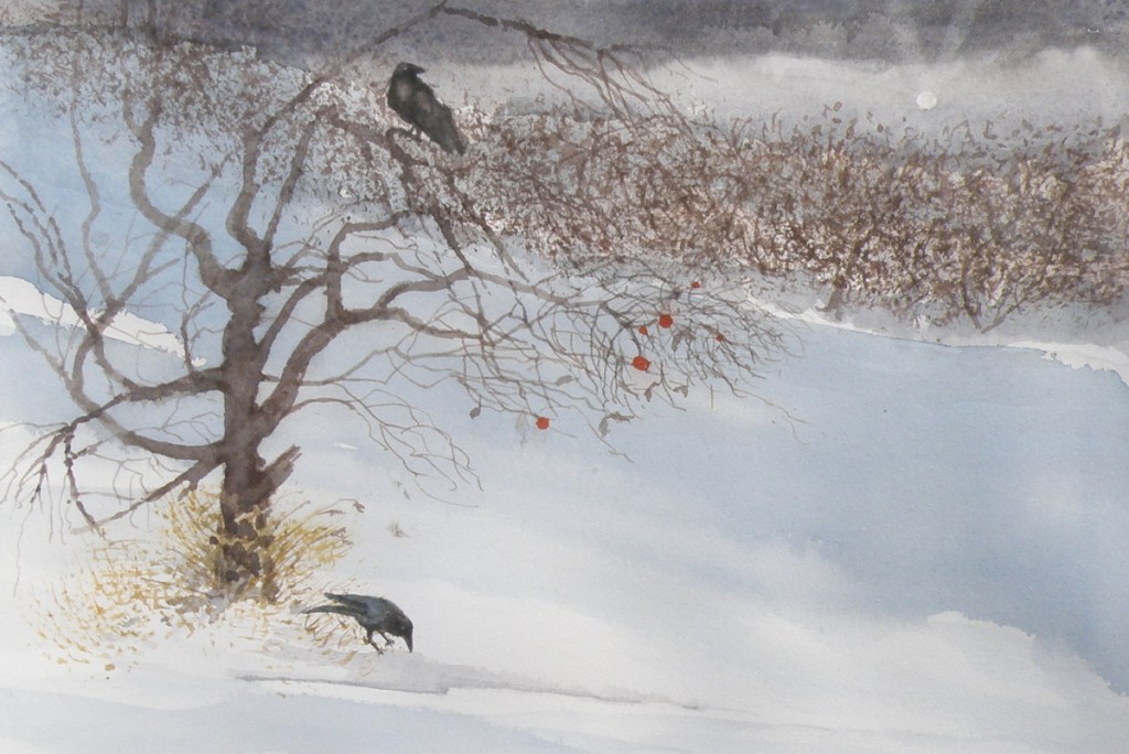‘Raven Winter’, watercolour on treated art board, 9″ x 12″