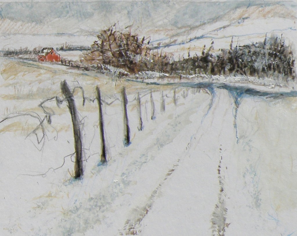 Although this painting is not of an actual barn or photographed scene, it attempts to capture the spirit of what the area looks like under a snowy mantle when viewed from the road leading towards the lake. I’ve done it from my collective memory, rather than choosing to make use of photographs or while on location.