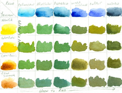 While one is actually in the process of painting a landscape with a variety of greens, it is entirely possible to include in the painting all of the above blues, through washes, cloud shadows, sky and/or water, and generally just finding ways to get them all in there. Likewise, the full range of yellows can also find their way into the painting. Doing this then puts all the blues in the scene, as well as all the yellows, and sets the stage for being able to harmoniously use every single green (and more) shown on ‘CharM’s very helpful chart(s).